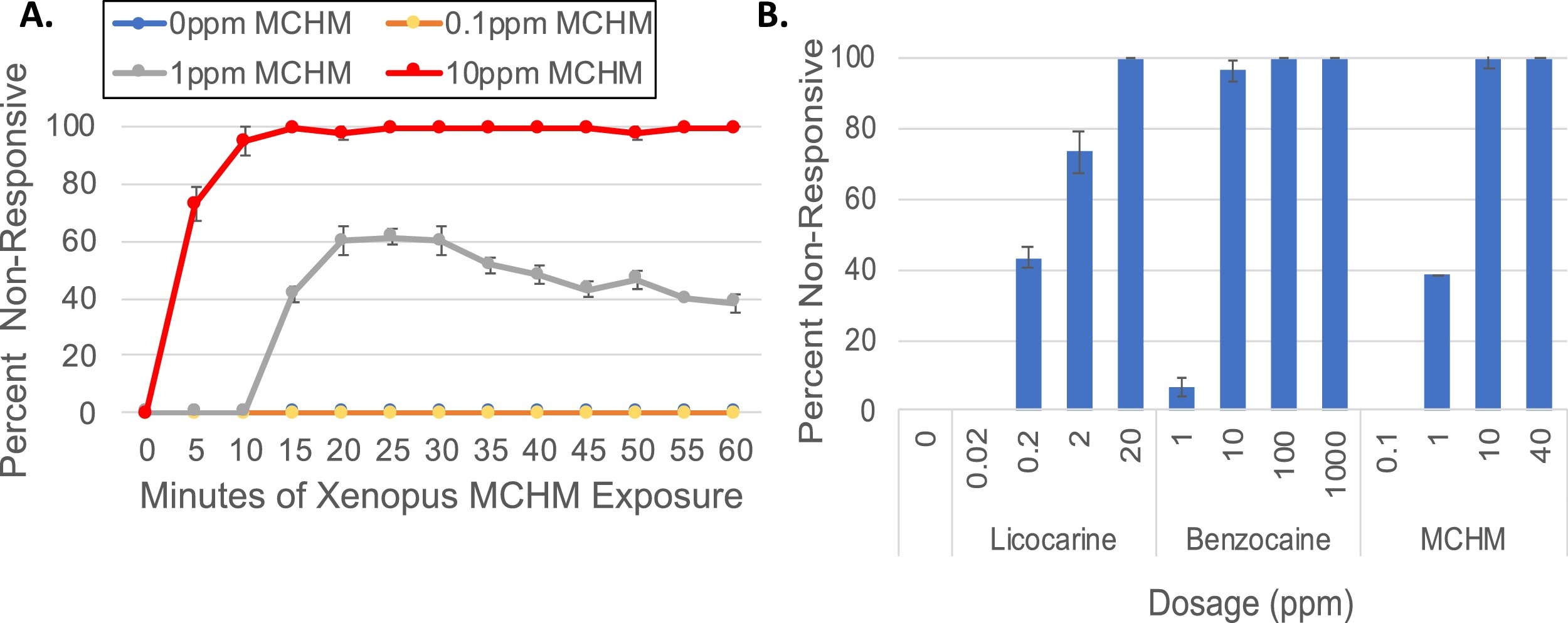 Fig. 2. Non-responsive embryos over a 60-minute incubation with MCHM. A. Stage ∼35 embryos were treated with the indicated concentration of MCHM, and responses to gentle touching were recorded as described in Materials and Methods (n = 250 per sample, N = 5). B. Quantitation of movement with different concentrations of lidocaine benzocaine, and MCHM with concentrations indicated in ppm after one hour of incubation (n = 60 per sample, N = 3).