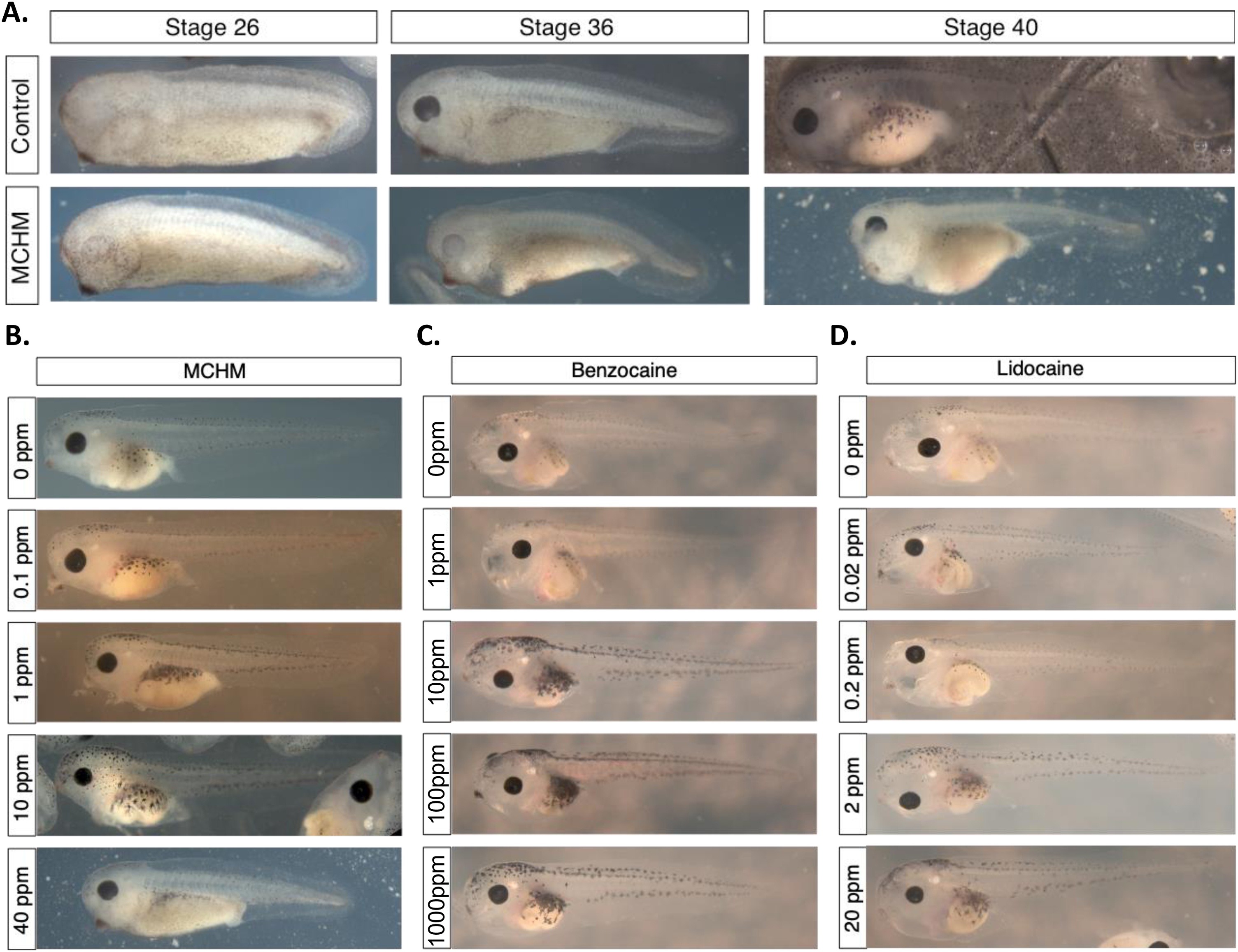 Fig. 3. Developmental defects displayed by surviving embryos with MCHM, benzocaine, and lidocaine. A. Xenopus embryo morphology at the indicated stages are shown when cultured in 100âppm MCHM at NF stage 19 (nâ=â400 per sample, Nâ=â4). B. Xenopus embryo morphologies when cultured in different concentrations of MCHM. C. Xenopus embryo morphologies when cultured in different concentrations of benzocaine. D. Xenopus embryo morphologies when cultured in different concentrations of lidocaine. For B-D, nâ=â60 per sample, Nâ=â3.