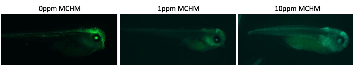Figure S2 Developmental defects observed in the snai2:eGFP transgenic Xenopus tropicalis line. X. tropicalis embryos were cultured in 0, 1, and 10ppm MCHM from NF stage 2 and observed at stage 40 (n=90 per sample, N=3).