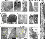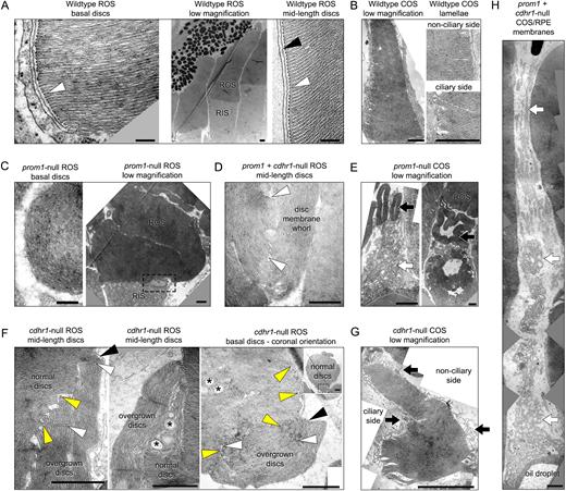 Fig. 2. TEMs demonstrating the principal changes in ultrastructure of prom1-null, cdhr1-null, and prom1 plus cdhr1 double-null mutant X. laevis compared to wild-type controls. (A) Wild-type ROS ultrastructure is highly ordered and consists of stacked OS membrane discs with properly formed hairpins (white arrowheads) that are meticulously aligned and enclosed within a plasma membrane (black arrowhead) (n=3). (B) Wild-type COS feature highly ordered stacks of disc lamellae. The leading edges of the lamellae opposite the connecting cilium are neatly aligned, whereas the hairpins near the connecting cilium are not as well aligned (n=3). (C) Prom1-null ROS sometimes lacked hairpins in the basal discs and had a severely convoluted structure where the disc membranes were overgrown and folded in on themselves. There were some instances of disc membrane invagination into the rod inner segment (dashed box) (F0, n=4). (D) Prom1 plus cdhr1 double-null ROS were indistinguishable from prom1-null ROS and featured whorls of overgrown membranes that contained disc rims (white arrowheads) (F0, n=3). (E) Prom1-null COS were difficult to observe, but commonly seen features were loops of disc membrane that appeared unattached to the cone inner segment (CIS; black arrows) and the presence of thin, loosely folded membranes above the CIS (white arrows; F0, n=3). (F) The principal feature of cdhr1-null ROS was overgrown and misaligned discs that were oriented vertically instead of horizontally within the ROS plasma membrane. Areas of overgrowth were commonly associated with large (asterisks) or small (yellow arrowheads) bubbles of membranes around the area where disc orientation changes occurred. Overgrowth of disc membrane was easily seen when the ROS was in a coronal orientation, and these areas of disc overgrowth or disorganization appeared to be contained within the plasma membrane (black arrowhead). Hairpins (white arrowheads) were still present in overgrown disc membranes (F0, n=5). (G) COS ultrastructure appeared mostly normal in cdhr1-null X. laevis, but some COS had overgrown lamellae membranes that resulted in the loss of alignment at the ciliary and non-ciliary sides of the outer segment, giving it a frayed appearance (black arrows) (F3, n=2/5 samples studies). (H) COS in prom1 plus cdhr1 double-null X. laevis were similarly difficult to visualize to prom1-null animals, and they also comprised loose, convoluted and looped thin membranes (white arrows; F0, n=3). From three replicates. Scale bars: 800 nm, except in right-hand panel for C (2 µm). |