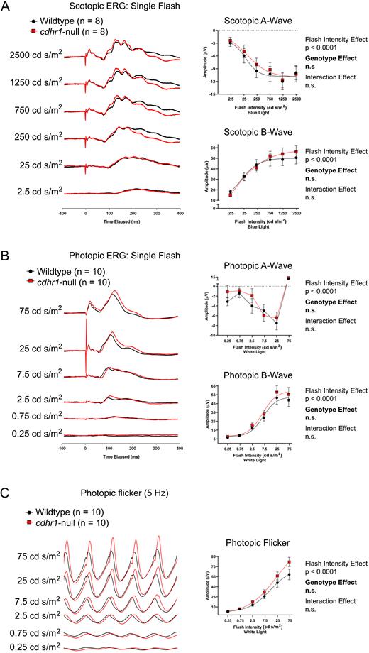 Fig. 5. Averaged scotopic single-flash recordings, photopic single-flash recordings, and photopic 5 Hz flicker recordings from wild-type and cdhr1-null F3 animals. (A) Averaged scotopic single-flash recordings from wild-type (n=8) and cdhr1-null animals (n=8). (B) Averaged photopic single-flash recordings from wild-type (n=10) and cdhr1-null animals (n=10). (C) Averaged photopic 5 Hz flicker recordings from wild-type (n=10) and cdhr1-null animals (n=10). Waterfall plots (left) and transformed linear regression curves (right) were used to visualize and compare wild-type and cdhr1-null A-wave and B-wave responses. The large positive A-wave values at 75 cd s/m2 (photopic single-flash recordings) were likely an artifact introduced by the large early receptor potential response measured by the electrode used in this experiment. Data analysis utilized a two-way ANOVA with Sidak's post hoc test. Data are plotted as mean±s.e.m. From one replicate. |