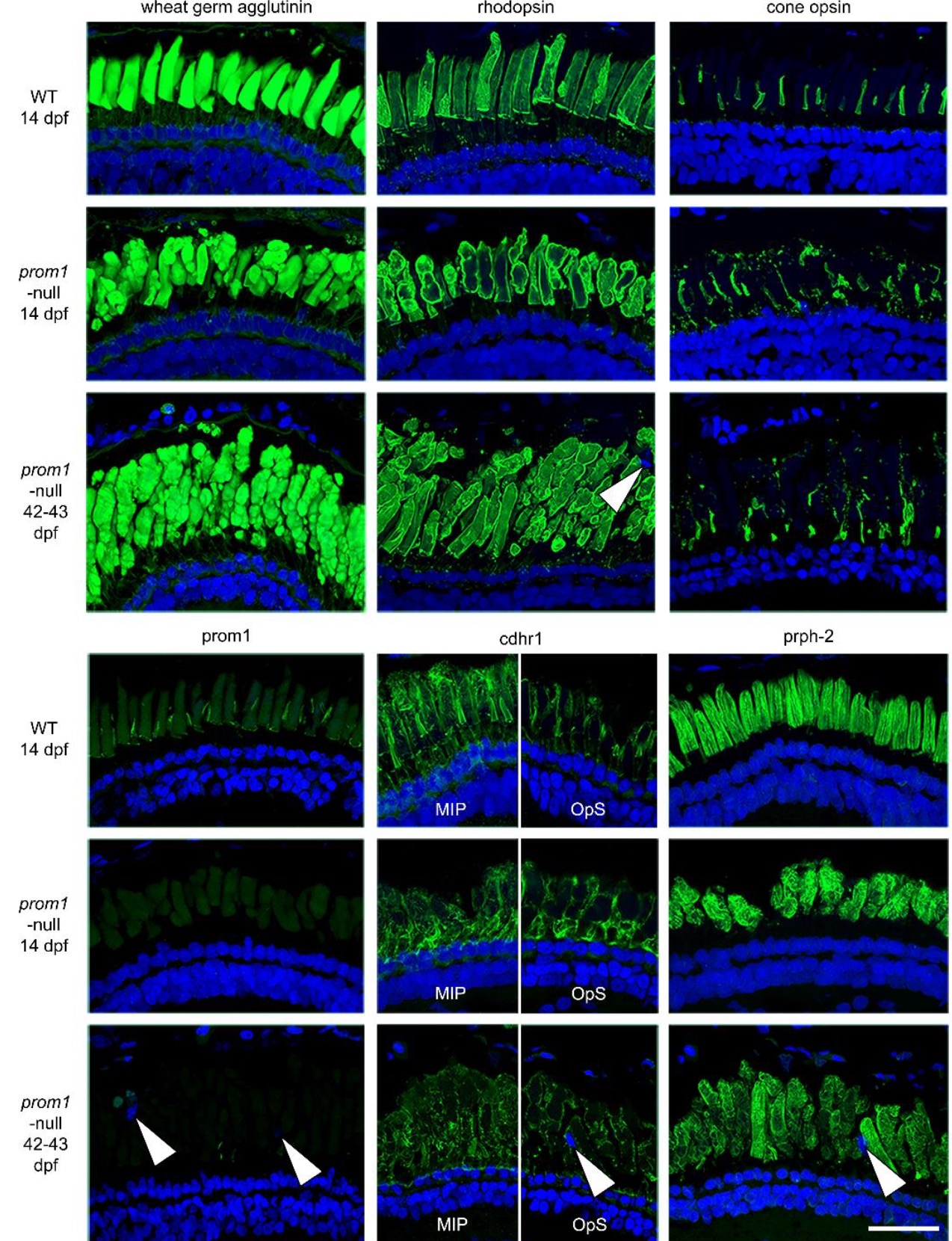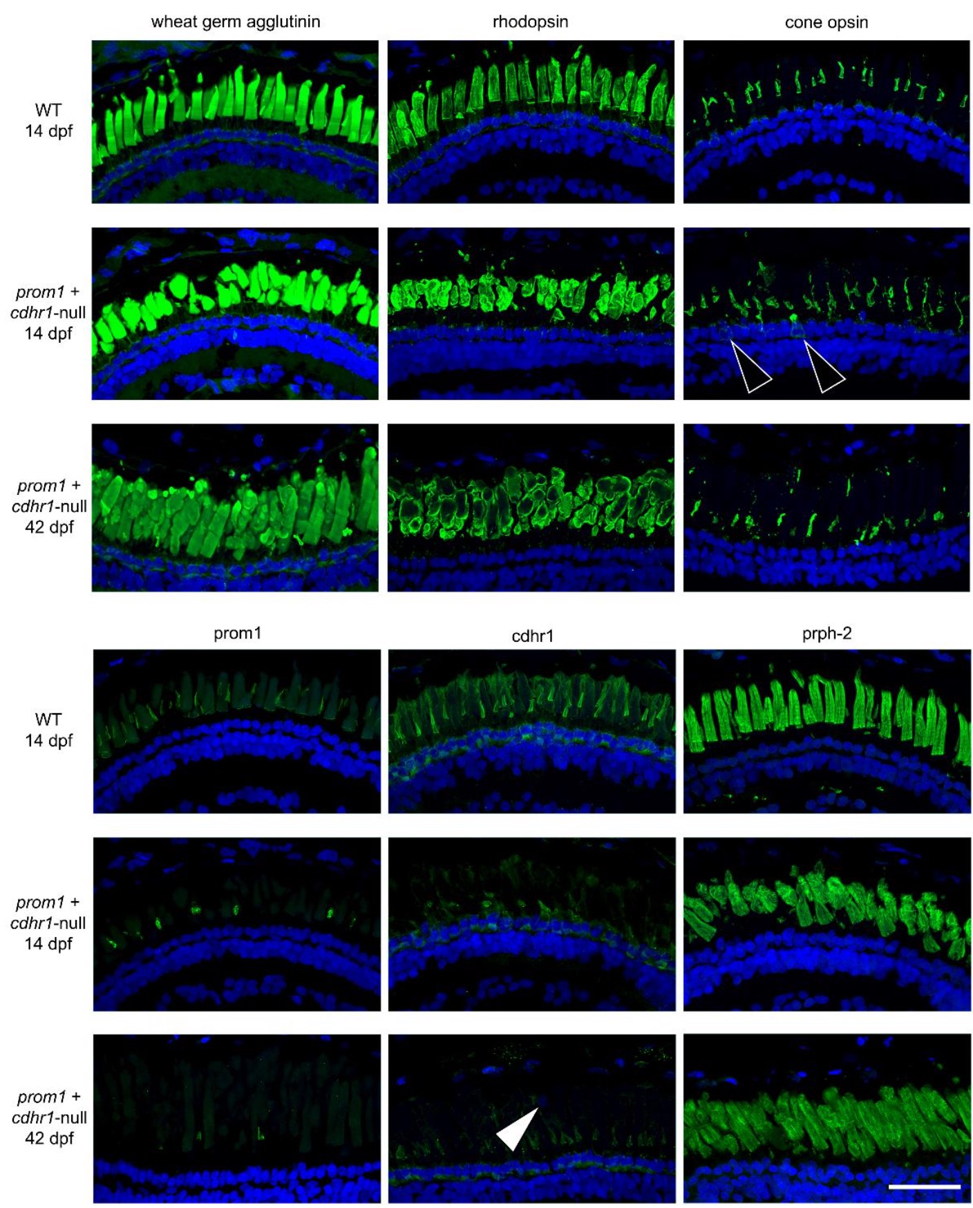 Figure S5. Immunolabelling of various photoreceptor outer segment proteins in wildtype (14 dpf, top; n = 11) and F0 prom1 + cdhr1-null (14 dpf, middle, n = 14; 42-43 dpf, bottom, n = 7) retinas. Similar to prom1-null animals, there were occasional instances of mislocalization of cone opsin to the inner segment (black arrowheads) and an increase in condensed nuclei in the outer segment layer in older animals (white arrowhead). Three replicates. Channels: green = protein of interest, blue = Hoechst. Scale bar = 50 μm. Abbreviations: dpf = days post-fertilization, prph-2 = peripherin-2, WT = wildtype. |