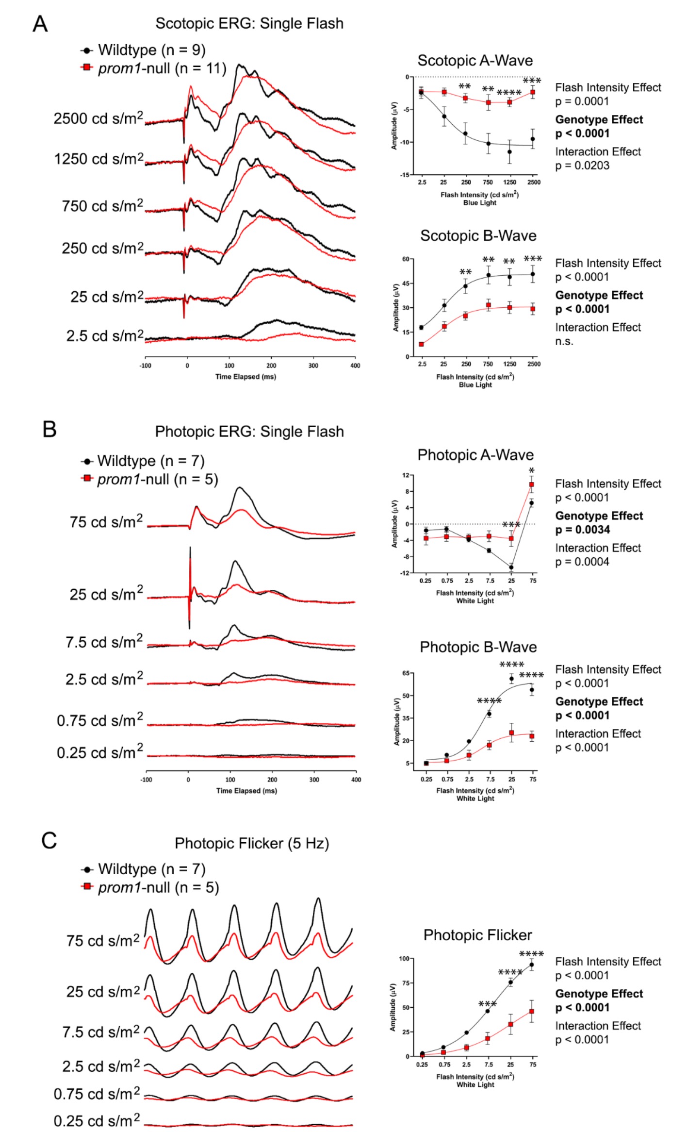 Fig. 3. Averaged scotopic single-flash recordings, photopic single-flash recordings and photopic 5 Hz flicker recordings from wild-type and prom1-null F0 animals. (A) Averaged scotopic single-flash recordings from wild-type (n=8) and prom1-null animals (n=7). (B) Averaged photopic single-flash recordings from wild-type (n=7) and prom1-null animals (n=7). (C) Averaged photopic 5 Hz flicker recordings from wild-type (n=7) and prom1-null animals (n=7). Waterfall plots (left) and transformed linear regression curves (right) were used to visualize and compare wild-type and prom1-null ERG waveforms and A- and B-wave amplitudes. Data are plotted as mean±s.e.m. From one replicate. *P<0.05, ***P<0.001, ****P<0.0001 (two-way ANOVA with Sidak's post hoc test). |