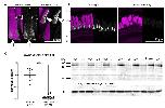 Figure S1. Immunoreactivity for prom1 protein in wildtype and prom1-null X. laevis. (A) In wildtype animals, prom1 protein was localized to the base of the ROS (white arrows), small puncta on the outside of the ROS (black arrowheads), and along one edge of the COS (white arrowheads; n = 9). (B) Prom1 immunoreactivity was lost in prom1-null retinas and the ROS/COS were dysmorphic (F1, n = 14). (C) Western blot for prom1-null F0 animals (n = 10) showed a significant reduction in prom1 protein immunoreactivity in bands of the correct molecular weight for the prom1 protein (~95 kDa) compared to wildtype animals (n = 11); p < 0.0001, unpaired student’s t-test. One animal showed successful editing by Sanger sequencing but had a smaller reduction in prom1 immunoreactivity than the others (ǂ). The upper panel shows prom1 protein and the lower panel is a duplicate blot with α-acetylated tubulin (~49 kDa) used as a loading control. Two replicates. Channels: magenta = WGA, green/white = prom1. Abbreviations: WT = wildtype. |