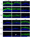 Figure S2. Immunolabelling of various photoreceptor outer segment proteins in wildtype (14 dpf, top, n = 18) and F0 prom1-null (14 dpf, middle, n = 26; 42-43 dpf, bottom, n = 26) retinas. There was no mislocalization of any protein surveyed into the inner segment of the photoreceptors, with the exception of some rare instances of mislocalization of cone opsin to the inner segment (see Fig. 1). As animals aged, there was an increase in Hoechst-stained and autofluorescent deposits in the outer segment layer (white arrowheads). Seven replicates. Channels: green = protein of interest, blue = Hoechst. Abbreviations: OpS = optical section (centre of stack). Scale bar = 50 μm. |