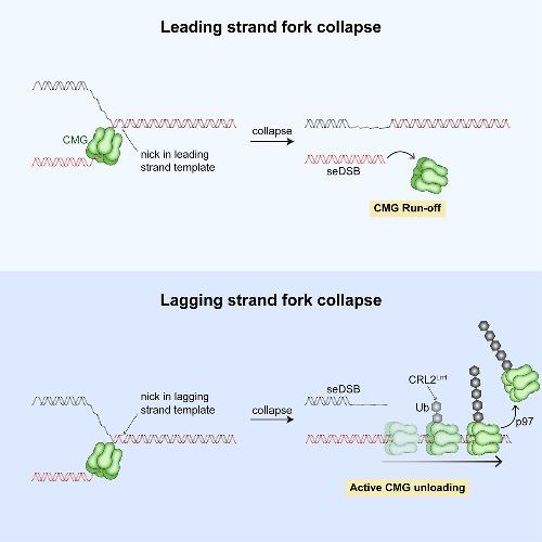 DNA damage impedes replication fork progression and threatens genome stability. Upon encounter with most DNA adducts, the replicative CMG helicase (CDC45-MCM2-7-GINS) stalls or uncouples from the point of synthesis, yet eventually resumes replication. However, little is known about the effect on replication of single-strand breaks or "nicks," which are abundant in mammalian cells. Using Xenopus egg extracts, we reveal that CMG collision with a nick in the leading strand template generates a blunt-ended double-strand break (DSB). Moreover, CMG, which encircles the leading strand template, "runs off" the end of the DSB. In contrast, CMG collision with a lagging strand nick generates a broken end with a single-stranded overhang. In this setting, CMG translocates along double-stranded DNA beyond the break and is then ubiquitylated and removed from chromatin by the same pathway used during replication termination. Our results show that nicks are uniquely dangerous DNA lesions that invariably cause replisome disassembly, and they suggest that CMG cannot be stored on dsDNA while cells resolve replication stress.