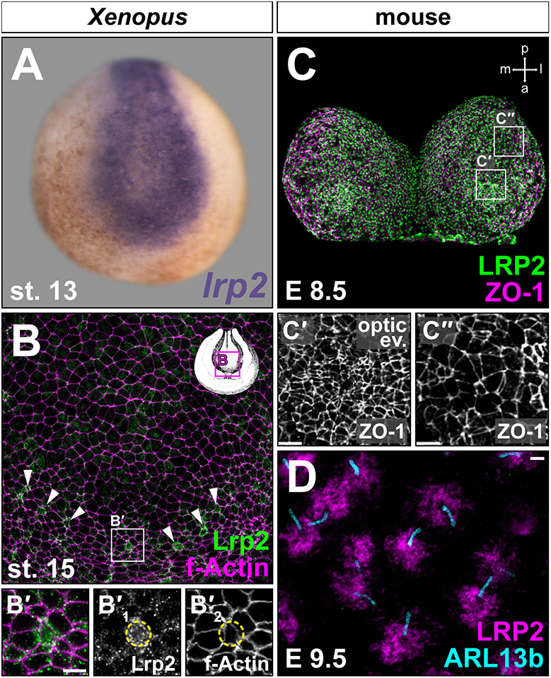 Fig. 1. Lrp2 is expressed in the neuroepithelium and increased in constricting cells. (A-D) lrp2 mRNA (A) and protein (B-D) expression analyzed by in situ hybridization and immunofluorescence, respectively. Neurula stage (st.) embryos (frontal views, dorsal upwards). (A) Neural lrp2 expression. (B) Stage 15 forebrain region; Lrp2 is expressed in most cells (outlined by F-actin); single cells with high Lrp2 levels are located along the anterior rim of neural folds (NFs; arrowheads). (Bâ²) Magnification of boxed region in B; increased Lrp2 levels are found in cells with small apical surface (circled in single channels Bâ²1 and Bâ²2). (C) LRP2 is detected throughout E8.5 anterior NFs, concentrated in areas undergoing apical constriction. Compare Câ² (constricted cells in optic evagination) with Câ³ (dorsolateral cells with larger cell surface). ZO-1 marks cell boundaries. (D) STED imaging; LRP2 is condensed around neuroepithelial primary cilia (ARL13b+) at E9.5. Scale bars: 10â µm in Bâ²,Câ²,Câ³; 1â µm in D. |