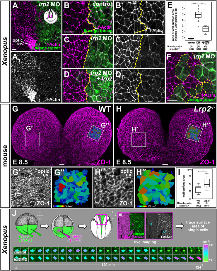 Fig. 3. Lrp2 is cell-autonomously required for efficient apical constriction. Apical constriction (AC) in forebrain neural plate (NP) cells. (A,A1) F-actin revealed a larger apical cell surface in lrp2 morpholino oligomer (MO)-injected cells (identified by lineage tracer fluorescence) compared with the uninjected side; there was a lack of AC in the optic evagination (ev.) area on the injected side. (B-E) Quantification of cell surface areas in unilaterally injected lineage tracer-only controls (B,B1), lrp2 morphants (C,C1) and morphants with re-introduced lrp2 (D,D1). (E) Cell surface area ratios calculated between injected and uninjected sides; box plot and Wilcoxon rank sum test. (F) The intermingling of constricting NP cells with lrp2 morphant cells demonstrates cell autonomy of AC failure. (G,H) Frontal views of the forebrain area of wild-type (WT; G) and Lrp2â/â (H) 7-somite stage mouse embryos at E8.5; ZO-1 delineates cell borders. (Gâ²,Hâ²) Magnification of optic evagination area, indicated in G,H; cell surface area was increased in mutants. (Gâ³,Hâ³) Color-coded maps (areas indicated in G,H) visualize cell surface area. (I) Graphical representation of results from Gâ³,Hâ³; four areas from each embryo were analyzed; box plot and Student's t-test. (J) Live imaging (Movie 2) using LifeAct indicates a failure of AC in morphant cells, despite actin dynamics. Cell surface area measurements revealed size fluctuations; final AC occured in control cells only. Scale bars: 25â µm in A-D,F; 20â µm in G,H. |