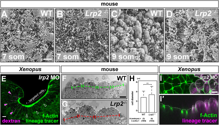 Fig. 4. No efficient remodeling of the apical surface in cells with apical constriction failure. (A-D) Scanning electron micrographs of mouse neuroepithelial cells at E8.5. Prominent filamentous, microvilli-like protrusions were present on wild-type (WT; A) and LRP2-deficient (Lrp2â/â; B) cells at the 7-somite (som) stage. Reduced filamentous protrusions are seen at the 9-somite stage in the wild type (C), but are persistent in Lrp2â/â (D). (E) Transverse section of Xenopus forebrain area at stage 19; lrp2 morpholino oligomer (MO)-positive cells are identified by their enlarged apical surface and by cytosolic lineage tracer fluorescence. Embryos were incubated in fluorescent dextran from stages 14 to 19. Signal is present in constricted cells (filled arrowheads) but absent from MO-targeted cells (empty arrowheads). F-actin staining indicates cell borders. (F,G) Transmission electron micrographs of E9.5 coronal ultrathin sections. Normal apical cell diameters (green lines) and moderate bulging are present in the wild type (F); increased cell diameter (red lines) and excessive bulging are found in Lrp2â/â cells (G). (H) Quantification and statistical analysis of cell diameters. Student's t-test. Data are mean±s.e.m. (I) En face view of neural plate showing apically enlarged lrp2 MO-targeted cells (lineage tracer+) bulged outwards, see orthogonal view (Iâ²; optical section at level indicated in I). Scale bars: 2â µm in A-D; 20â µm in E; 2â µm in F,G; 10â µm in I. |