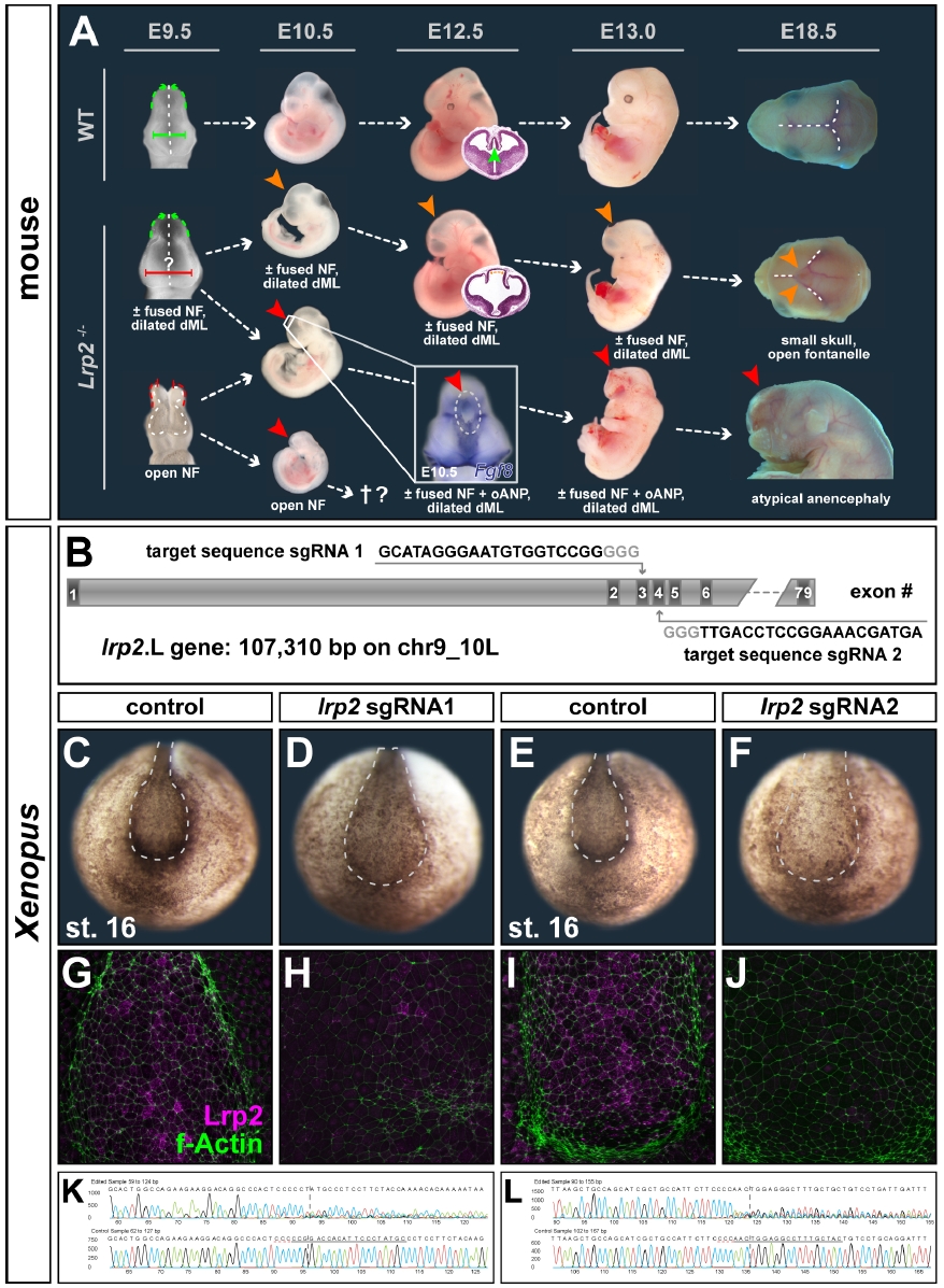 Fig. S2: Mouse neural tube closure phenotypes and CRISPR-Cas9-mediated genome editing of lrp2.L in Xenopus laevis. (A) A putative developmental time line of neural tube (NT) defects (NTDs) in Lrp2-/- mouse embryos. Note that embryos are not strictly to scale between stages, emphasis is on visualization of NTD progression. Top row: wild type (WT) embryos at embryonic day (E) 9.5, 10.5, 12.5, 13.0 and 18.5. Lower rows: Lrp2-/- embryos of the respective stage (st.). Frontal views of heads at E9.5 and inset in E10.5, lateral views of whole embryos at E10.5 through E13.0. E18.5: top views of heads in upper two specimens, lateral view of lower specimen. In all WT embryos from E9.5 onwards, the neural tube was closed (green arrows) and telencephalic neural folds (NF) were fused, creating a continuous dorsal midline (dML; white dotted line). The closed NT has a normal width (green bar). Two phenotypes of Lrp2-/- embryos at E9.5: the NT was either closed with a dilated dML (red bar) or entirely open (red and white dotted lines). Question mark on the dML indicates a putatively open anterior neuropore (ANP), which was not readily visible at E9.5. From E10.5 onwards, three putative âlineagesâ of development could be tracked: 1) orange markers - embryos with a more or less (±) closed NF and dilated dML (orange arrowheads), readily visible on transverse sections at E12.5 (compare area indicated by green arrowhead in WT and area indicated by orange line in mutant). These embryos most likely gave rise to embryos at E18.5 with a short head and open fontanelle, through which choroid plexus tissue can protrude (cf. Fig. 3A in (Willnow et al., 1996)). 2) red markers - embryos with ± fused NF that had a readily visible opening at the level of the ANP (red arrowheads), visualized via Fgf8 expression in the dML at E10.5 (inset). In such embryos, the open (o) ANP probably increased in size (E13.0), leading to exposure and extrusion of NT tissue (cf. Fig. 2E, (Spoelgen et al., 2005)), finally causing atrophy of anteriormost brain tissue which culminated in an atypical form of anencephaly at E18.5. 3) growth-retarded embryos at E10.5 had open neural folds and probably died after mid-gestation due to cardiovascular defects (Baardman et al., 2016; Christ et al., 2020). Numbers of Lrp2-/- embryos at E9.5 and E10.5 with fused NF and dilated dML (oANP not visible, therefore not scored): 33 / 51, 65 %; with open NF: 18 / 51, 35 %. Embryos at E12.5 and E13.0 with fused NF and dilated dML with a range of closed to wide open ANP: 22 / 22 100 %; no embryos with open NF. Over the past five years, about 2 / 3 of embryos at E18.5 with shortened skull and open fontanelle, 1 / 3 with atypical anencephaly. (B) Schematic representation of Xenopus laevis lrp2.L gene structure; target sequence for single guide (sg) RNA-binding in exon 3 and 4 is shown, protospacer-adjacent motif (PAM) in gray letters. (CJ) Injection of Cas9-ribonucleic particles (CRNP) assembled with sgRNA1 or 2 into zygotes impaired neural plate narrowing and lengthening (C-F) and reduced Lrp2 (G-J) in CRISPants compared to controls. f-Actin marks cell circumference. (K, L) Analysis of sequence flanking target sites confirmed editing in CRNP-injected samples (top row) compared to control samples (lower row). |