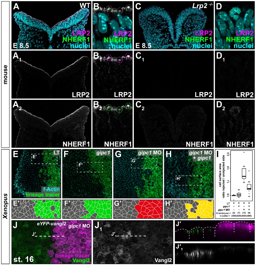 Fig. S5: Lrp2-interacting scaffold proteins in neural tube closure. (A-D) Immunofluorescence reveals co-localization of LRP2 and NHERF1 on coronal sections of wild type (WT; A, B) and loss of both markers in LRP2-deficient (Lrp2-/-; C, D) mice at embryonic day (E) 8.5 (9 somites). (A1, 2 - D1, 2) Channels shown in grayscale. (E-I) Morpholino oligomer (MO)-mediated gipc1 loss-of-function (LOF) phenocopies the Lrp2 LOF phenotype. 4-8 cell embryos were injected into one dorsal animal blastomere with lineage tracer (LT) and MO / mRNA as indicated; cell borders delineated by f-Actin staining using fluorescently labeled phalloidin. (Eâ-Hâ) Cell outlines from boxes indicated in (E-H), colors represent severity of phenotype. No impairment of constriction upon injection of LT (E, Eâ) or gipc1 (F, Fâ; green), severe impairment in MO-injected cells (G, Gâ; red), amelioration of impaired constriction upon re-introduction of gipc1 in MO-injected cells (H, Hâ; yellow). (I) Graphical representation of experimental data from (A-D), Wilcoxon rank sum test. (J) Magnified views of forebrain area; unilateral injection of gipc1MO similar to (E-H). Note reduction of Vangl2 in morphant cells (10/12 embryos from 5 independent experiments), also evident in transversal optical sections (Jâ, Jâ1). |