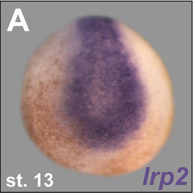 lrp2 (LDL receptor related protein 2) gene expression in X. laevis embryo, NF stage 13, assayed by in situ hybridization, anterior view dorsal up. |