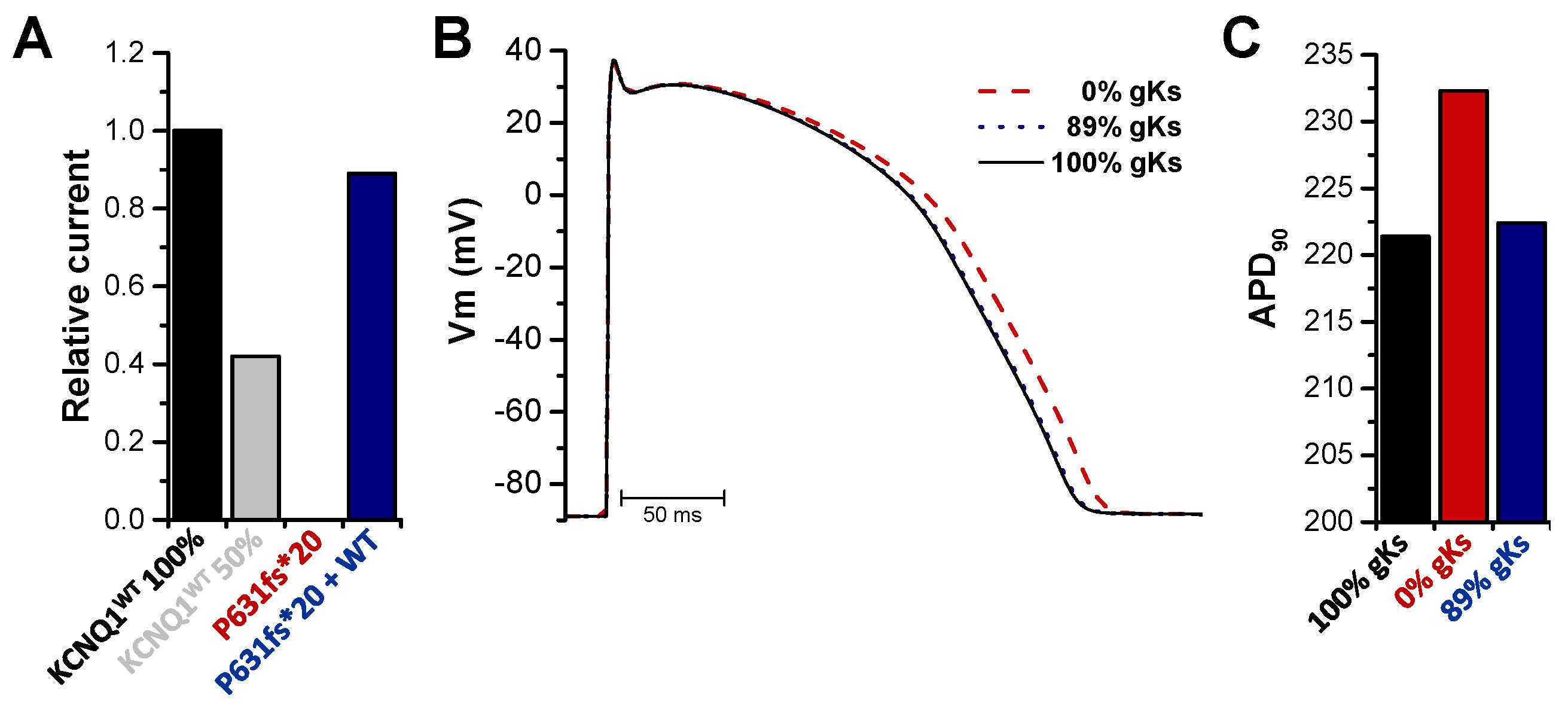 Figure 5. Action potential modelling with the homozygous or heterozygous KCNQ1P631fs*20 mutation in the IKs channel complex. (A) Mean current amplitudes of 100% KCNQ1WT injected together with KCNE1, 50% KCNQ1WT injected together with KCNE1, 100% KCNQ1P631fs*20 injected together with KCNE1 or 50% KCNQ1WT plus 50% KCNQ1P631fs*20 injected together with KCNE1. For all data, the endogenous xIKs current recorded by injection of KCNE1 alone was subtracted. Data were normalized to KCNQ1WT 100%. (B) Action potential simulations using the OâHara-Rudy ventricular cell model. Conductivity of the IKs channel was set to 100% for wild-type (black), 0% for the homozygous (red, dashed line) and 89% for the heterozygous state (blue, dotted line) as calculated in (A). (C) APD at 90% repolarization (APD90) was evaluated for each configuration after the simulations achieved a steady state.