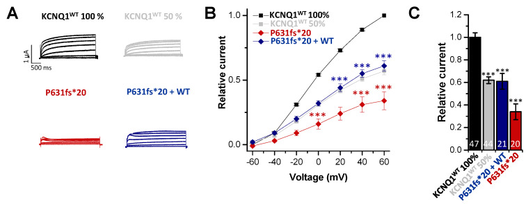 Figure 2. Functional effects of the KCNQ1P631fs*20 mutation. (A) Representative current traces of oocytes injected with KCNQ1WT 100% (14.5 ng/oocyte), KCNQ1P631fs*20 (14.5 ng/oocyte), KCNQ1WT 50% (7.25 ng/oocyte) or KCNQ1WT plus KCNQ1P631fs*20 (7.25 ng/oocyte each), respectively. Voltage was stepped from -60 to +60 mV in 20 mV steps lasting 3000 ms, from a holding potential of −80 mV. (B) Current voltage relationships obtained by blotting the current at the end of each voltage step for each voltage applied normalized to KCNQ1WT. In order to obtain the current-voltage relationship (I/V curve), all wild-type recordings were normalized to the value at +60 mV. The data of all the other constructs were also divided by the average current amplitude of the wild-type at +60 mV of the respective recording day. (C) Current amplitudes analyzed at +40 mV and normalized to KCNQ1WT (100%). All the data, also that of the wild-type recordings, were divided by the average current amplitude of the wild-type at +40 mV of the respective recording day. Numbers of oocytes recorded are indicated within the bar graphs. Values are expressed as means ± S.E.M. Error bars represent S.E.M. values. Significance was assessed using two tailed Student’s t-test. Asterisks indicate significance: ***, p < 0.001.