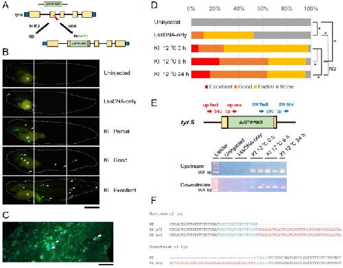 Fig. 3. HDR-mediated knock-in (KI) using the CRISPR/Cas9 system and lssDNA. (A) Schematic diagram of HDR-mediated knock-in into the exon of tyr. S. Blue boxes and yellow boxes indicate untranslated regions and coding domain sequences, respectively. (B) Representative fluorescence images of (left column) heads, (center column) trunks, and (right column) tails of (first row) an uninjected control embryo, (second row) an embryo injected with lssDNA-only, and (third to fifth row) knock-in mutants. The embryos were classified into 4 groups according to the expression level of GFP: excellent, GFP expressed widely throughout the body; good, GFP expression was seen sparsely throughout the body; partial, GFP expression was seen sparsely in specific parts of the whole body; none, no GFP expression was seen. Arrowheads and asterisks indicate strong GFP signals and autofluorescence, respectively. White dashed lines indicate outlines of embryos. Scale bar: 1 mm. (C) Higher magnification image of trunk of an “excellent” knock-in embryo showing widespread GFP expression. Note that there are many GFP-expressing cells other than those with strong GFP expression indicated by arrowheads. Scale bar: 100 μm. (D) Frequency of GFP expression level in 3 groups (incubated at 12 °C for 0, 6, and 24 h, respectively), injected lssDNA-only, and uninjected control group (n = 37–51 in each condition. Sample numbers are shown in Supplementary Table S2). Embryos injected with lssDNA-only and uninjected controls were kept at 12 °C for 6 h and reared at 20 °C thereafter. The duration of the low-temperature incubation did not affect GFP expression lssDNA-only injected groups (Supplementary Fig. S3). We carried out the same experiments 3 times and representative results are shown. Other results are shown in Supplementary Fig. S4. ∗P < 0.01, NS (not significant), Fisher’s exact test with Holm correction. (E) Schematic diagram (top) of the strategy for genomic PCR used for genotyping and representative results (bottom). (F) Sequencing of 8 (for upstream) and 6 (for downstream) knock-in embryos and uninjected control. The tyr gRNA sequences are marked in blue; both ends of the CMV-acgfp cassette are marked in red; and PAM sequences are marked in green. The entire sequences of these samples are shown in Supplementary Fig. S5.