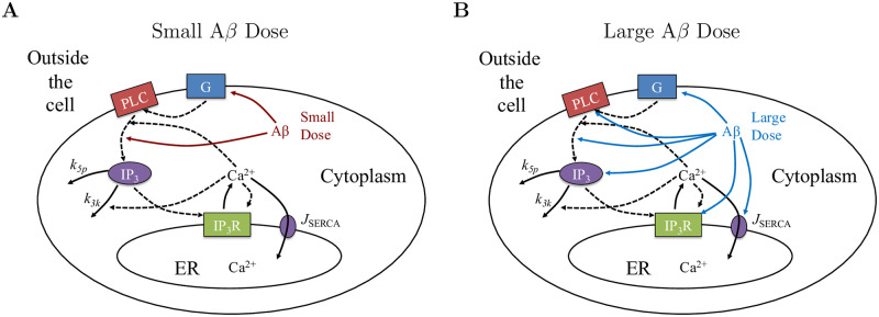 Fig 2. Model structure and components.Modeling assumptions for the location of impact of Aβ on the production of IP3 with key Ca2+ signaling mechanisms included in the closed-cell model. The key model assumptions for how Aβ impacts the IP3 signaling cascade are illustrated as red arrows for “small” doses in A. The impacted cellular mechanisms for “large” doses of Aβ are highlighted by the blue arrows in B. |