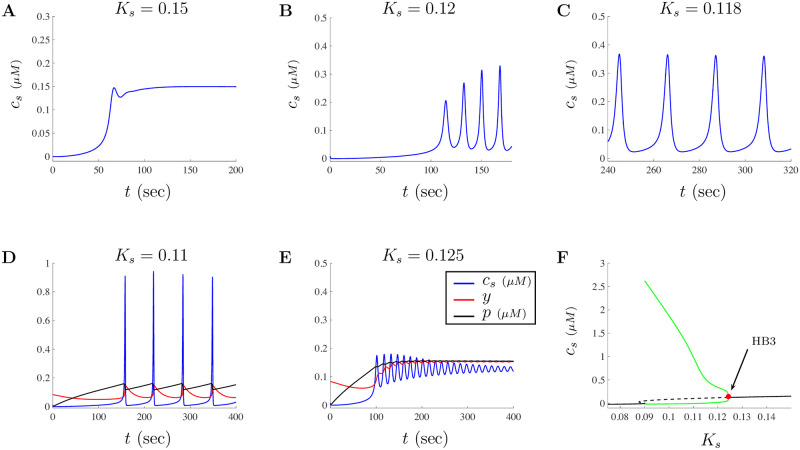 Fig 3. Model solutions mimic experimental Ca2+ patterns for doses of a = 1 μg/ml of Aβ.The dependence of model solutions for a dose of 1 μg/ml of Aβ on the cellular parameter Ks is investigated. A shows an increasing Ca2+ signal that settles to an increased steady-state when Ks = 0.15. B shows that oscillations in Ca2+ can exhibit increasing amplitudes such as those found in Fig 1D in [18]. C and D show that as the value of Ks decreases, the oscillatory patterns of the model reproduce the spike-like Ca2+ signals observed in Fig 1E in [18]. E illustrates an oscillatory solution with an increased steady-state Ca2+ homeostasis level when Ks is just above the Hopf point. Both D and E show the traces for cs, y, and p in blue, red, and black, respectively. F shows a simplification of the scaled bifurcation diagram with the bifurcation parameter Ks. Notice that as Ks decreases from the base value of 0.15, a transition from stable steady-states into periodic oscillations occurs through a Hopf bifurcation around HB3â0.1242. The dynamics around Ks = 0.09 include multiple Hopf bifurcations and has more complex structure than what is presented here. |