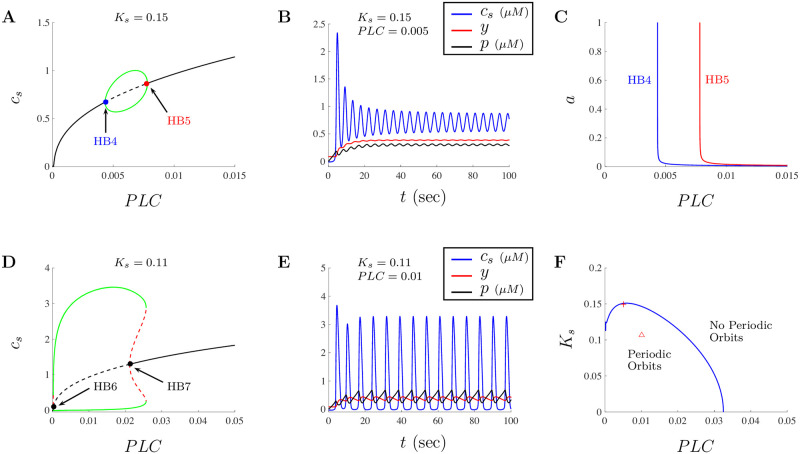 Fig 4. Dynamics of Ca2+ using PLC as a parameter for doses of a ⤠1 μg/ml of Aβ.Model dynamics for the subsystem Eqs (15)â(17) in terms of PLC and Ks. The bifurcation diagram when Ks = 0.15 with the subsystem parameters given in Table 2, is shown in A. The figure shows a typical Hopf bubble between two Hopf bifurcation values labeled HB4 and HB5 as PLC is varied. The subsystem solution when PLC = 0.005 is presented in B, where c, y, and p are shown in the blue, red, and black traces, respectively. C shows the two parameter bifurcation diagram when both PLC and a are varied. Note that only the small doses of a are considered and the region of oscillations shifts to the right as a decreases and PLC increases. D shows the subsystem bifurcation diagram when Ks = 0.011 including two Hopf bifurcation values labeled HB6 and HB7. E shows the subsystem solution when PLC = 0.01 where c, y, and p are shown in the blue, red, and black traces, respectively. F shows the two parameter diagram tracking the location of the Hopf bifurcation points when PLC and Ks are treated as parameters. The parameter space is separated into regions where periodic orbits exist and donât. The red cross and triangle correspond to the location of the parameter values used to generate the solutions in B and E, respectively. |