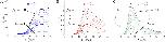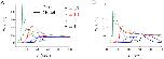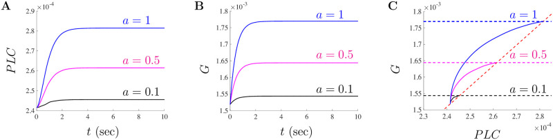 Fig 5. Steady-state values for PLC and G for doses of a ≤ 1 μg/ml of Aβ.The steady-state fraction of activated PLC and G-proteins settles to a new value when a = 0.1 (black), a = 0.5 (magenta), and a = 1 (blue) in A and B, respectively. Model solutions for the various small doses a-values are shown on the phase plane for PLC and G in C. The dashed lines correspond to the PLC nullcline (red) and the G nullclines (black, magenta, and blue). |