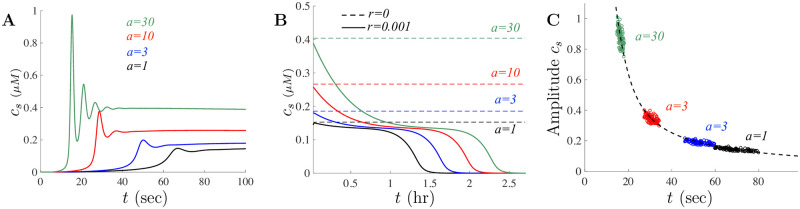 Fig 6. Amplitude and latency of model solutions vary with doses of Aβ.For the small doses parameters, A shows the model captures the increase in Ca2+ signal amplitude as well as the decrease in time to peak onset. B shows the long term impact of Aβ for doses of Aβ corresponding to a = 1, a = 3, a = 10, and a = 30 in black, blue, red, and green, respectively. The dashed lines in B correspond to the steady-state values in the event where the amount of Aβ does not decay and is fixed. C shows the location of 100 stochastically chosen cells under the given a-value. Each color-coded circle corresponds to the location of the solution peak and time of peak when cellular parameters are varied uniformly with 10% variation for the particular a value. The dashed black curve corresponds to the location of the amplitude peak for the small doses parameters for a ranging between (0.1, 40). |