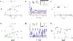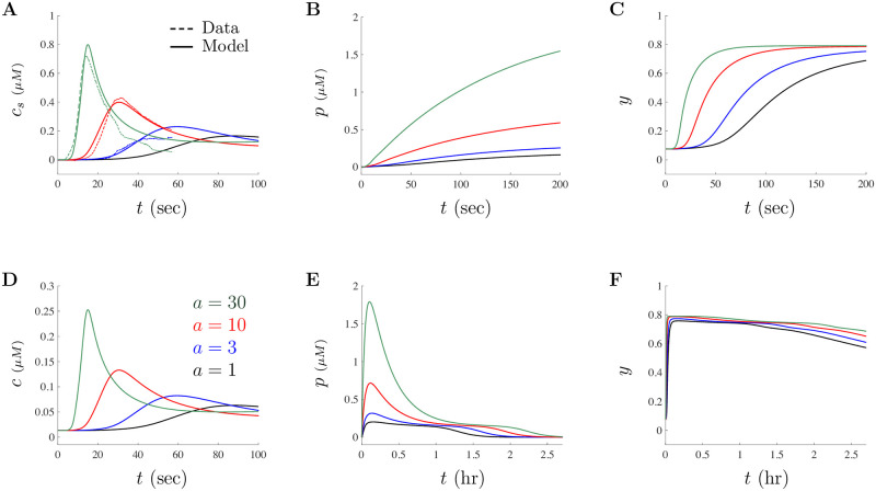 Fig 8. Model matches experimental data for large doses of Aβ.Model solutions for the “large” dose parameter set are illustrated in this figure. A shows model simulation (smooth curve) when a = 3 (blue), a = 10 (red), and a = 30 (green) overlaid on top of the rescaled experimental data (dashed curve) of [18]. Note that model solutions for the “large” dose parameters when a = 1 (black) is also shown here. B and C show the time evolution of model IP3 and PLC, respectively. D shows the unscaled Ca2+ concentration given by the model variable c for the three levels of Aβ and for a = 1 (black). E and F show the time evolution of p and y on the order of hours, respectively. Due to the Aβ decay incorporated in the model, all model solutions will eventually go back to the steady-state values. |