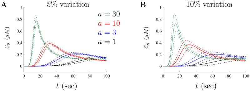 Fig 9. Model solutions under variation of parameters.The mean and corresponding standard deviations when the model is simulated for n = 100, 000 stochastically chosen parameter sets. The solid curves corresponds to the mean response and the dashed curves are the standard deviation above and below the mean. A and B illustrate the uncertainty in solutions when parameters are selected from a set with 5% and 10% deviation from the large doses base values given in Table 2, respectively. |