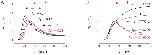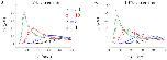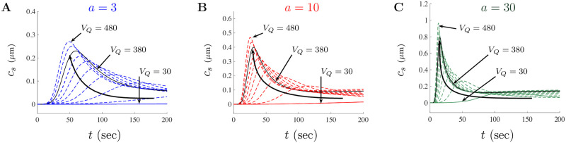 Fig 10. PRCC prediction on solution amplitude and time to peak for model parameter VQ.The impact of VQ is shown as a series of curves for a = 3, a = 10, and a = 30 in A, B, and C, respectively. In each diagram, the curved black arrow tracks the shift in the peak of solutions as VQ takes on various values ranging from VQ = 30 to VQ = 480. The black trace in each diagram represents the baseline VQ value for the large doses parameter set. |