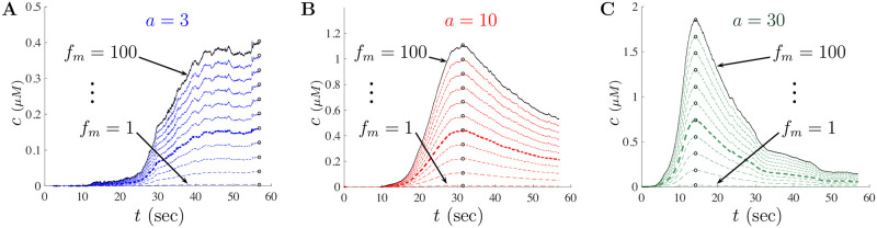 Fig 13. Impact of fm on rescaling of Ca2+ data.Changes in scaled experimental data when fm ranges from 1 to 100. In all figures, Rf = 100, KD = 0.3, and c0 = 0.05. Figs A, B, and, C correspond to the scaled data for a = 3, a = 10, and a = 30, respectively. The maximum value of each scaled experimental data set is shown by the open circle. The bold color curve corresponds to fm = 40, the value used throughout the simulations. |