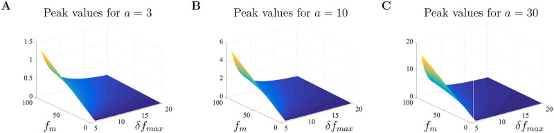 Fig 14. Peak values as a function of scaling parameters.Peak values of the data conversion as a function of fm and δfmax for a = 3 A, a = 10 B, and a = 30 C. In all simulations, Rf = 100, KD = 0.3, and c0 = 0.05 were fixed. This figure shows that the greatest scaling affects occur when fm and δfmax are large and small, respectively. |