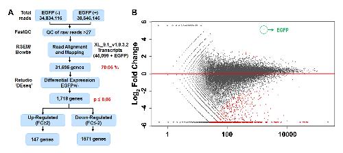 Figure S5. RNAseq of EGFP+ and EGFP− cells isolated from the transgenic line Xla.Tg(Dre.gfap:EGFP)Larra. (A) Flow chart of RNAseq bioinformatics analysis from EGFP+ and EGFP− cells. (B) Graph of the Log2 fold change of the differential gene expression between EGFP+ cells versus EGFP− cells after FACS and RNAseq. EGFP expression in EGFP+ cells (green) is highlighted. |