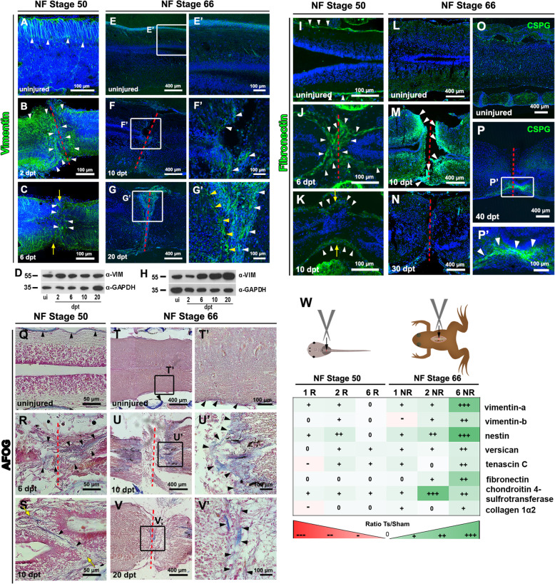 Fig. 3. Glial cell and extracellular matrix response to spinal cord injury in R-Stage and NR-Stage. a-c Immunostaining against vimentin in a uninjured, and at b 2 and c 6 dpt from animals at NF stage 50. d Western blot against Vimentin (Vim) and GAPDH of spinal cords samples obtained from uninjured (ui), and at 2, 6, 10 and 20 dpt in animals at NF stage 50. e-g Immunostaining against Vimentin in uninjured (e-eâ), and at (f, fâ) 10 and (g-gâ) 20 dpt from animals at NF stage 66. h Western blot against Vim and GAPDH of spinal cords samples obtained from uninjured (ui), and at 2, 6, 10 and 20 dpt in animals at NF stage 66. i-o Immunofluorescence against fibronectin in i uninjured, j 6 dpt, and k 10 dpt in NF stage 50; and l uninjured, m 10 dpt, and n 30 dpt in animals at NF stage 66. o-p Immunofluorescence against CSPG in o uninjured, and p-pâ at 40 dpt in NF stage 66. q-v AFOG staining shown Collagen (blue), cells (orange) and Fibrin (red) in q uninjured, and at r 6 and s 10 dpt in animals at NF stage 50, and in t-tâ uninjured, and at u-uâ 10 and v-vâ 20 dpt from animals at NF stage 66. w Analysis of gene expression change upon spinal cord injury comparing injured animals (Ts) with control sham (sham) surgery at 1, 2 and 6âdays after injury in NF stage 50 (1R, 2R and 6R), and NF stage 66 (1NR, 2 NR and 6 NR). Colored and crosses scale indicates the level of increase upon injury in green (+, ++, +++) and decrease in red (â, ââ, âââ), data obtained from a previous RNAseq analysis [49]. The red dotted lines (b, f, g, j, m, n, p, r, u, v) and yellow arrows (c, k, s) indicate the injured site. Nuclei stained with Hoechst in blue (a-c; e-g; i-p) |