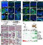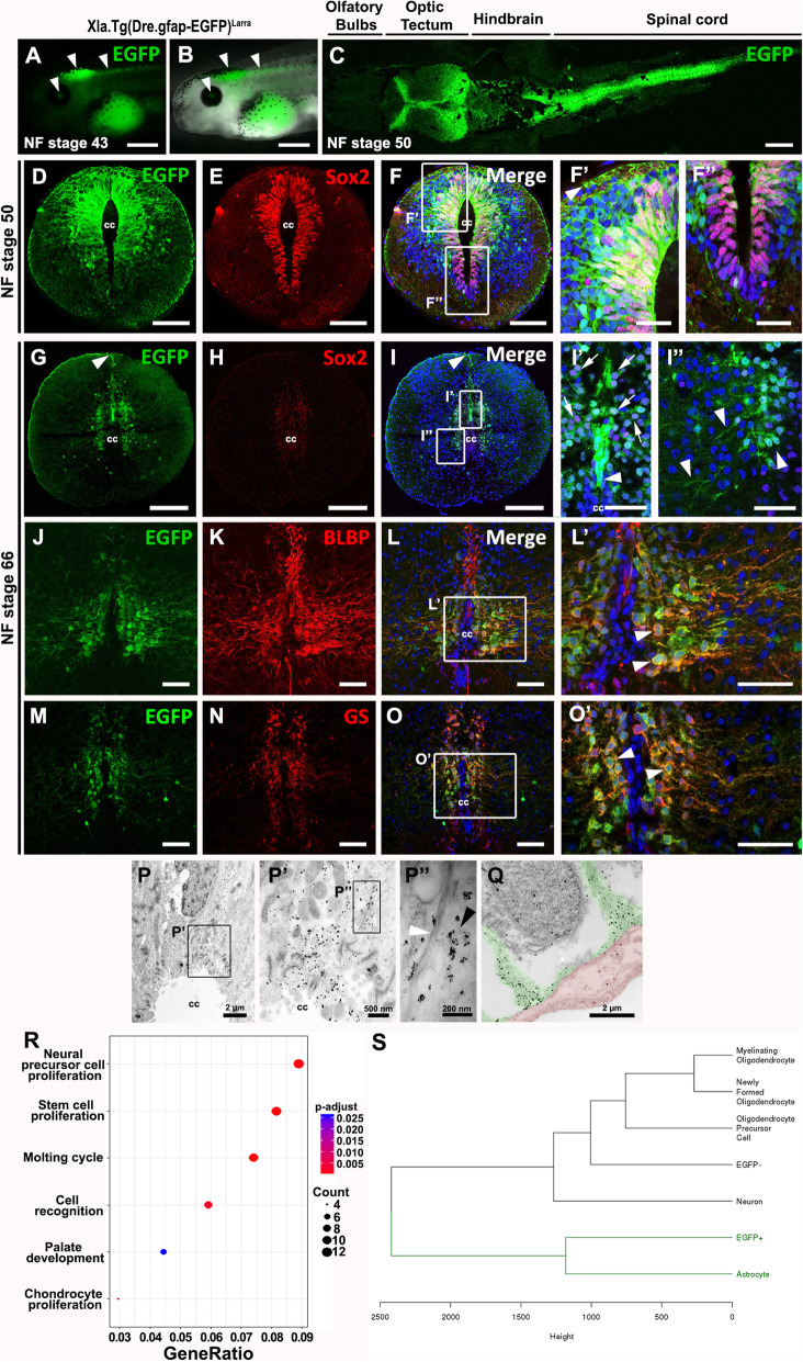 Fig. 4. Zebrafish regulatory regions of GFAP drive expression of EGFP in neural stem and progenitor cells, and astrocytes in Xenopus laevis spinal cord. A-C Lateral view of EGFP expression in the central nervous system at A, B NF-Stage 43, and C NF-Stage 50. A EGFP expression in the eye, brain and spinal cord (arrowheads). B EGFP/brightfield merge. C Dorsal view of EGFP expression in the optic tectum, hindbrain and spinal cord at NF stage 50. D-F Double staining against D EGFP and E Sox2. Panels F showed merge image, and Fâ, Fâ magnifications of the dorsal and ventral cells surrounding the central canal. G-Oâ Characterization of EGFP cells by double staining at NF stage 66. G-Iâ EGFP and Sox2; J-Lâ EGFP and Brain lipid-binding protein (BLBP); and M-Oâ EGFP and Glutamine synthase (GS). Nuclei are label in blue with Hoechst. P-Q Immunogold staining against EGFP at NF stage 50. P EGFP+ cell in contact with the central canal. Pâ Magnification of square in P. Expression of EGFP is visualized by the black dots of the gold staining. Pâ Magnification of square in Pâ. Gold staining (black arrowhead) in close apposition with filaments (white arrowhead). Q Endfeet from an EGFP+ cell (colored green) in close contact with blood vessel (colored red). R Gene ontology analysis of the RNAseq from EGFP+ cells revealed the stem cell/neural precursor cell identity of these cells. S Dendrogram of EGFP+ cells and EGFPâ cells showing the hierarchical clustering of EGFP+ cells with astrocytes and EGFPâ cells with neurons and oligodendrocytes. Scale bar: C, Fâ-Fâ³: 20âμm; A-B, D-F, Iâ-Iâ³, Lâ, Oâ: 50âμm; G-I, J-L, M-O: 200âμm |