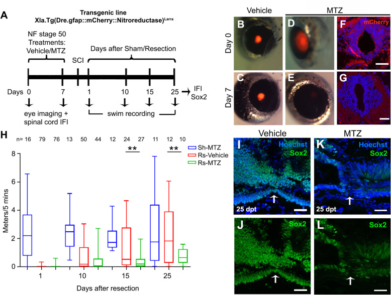 Fig. 7. Ablation of NSPCs blocks spinal cord regeneration. a Diagram of the treatment of zGFAP::mCherry-NTR transgenic animals with metronidazol (MTZ) or vehicle, followed by spinal cord resection, swimming recording, and histological analysis. b-e Eye imaging (b, d) before treatment, and 7âdays after incubation with c vehicle or e MTZ. f, g Spinal cord sections showing mCherry expression f before, and g 7âdays after MTZ treatment. h Graph of swimming at 1, 10, 15, 25 dpr in sham (Sh) operated animals treated with MTZ (Sh-MTZ, blue boxes), and resected (Rs) animals incubated with vehicle (Rs-Vehicle, red boxes) or MTZ (Rs-MTZ, green boxes). i-l Immunofluorescence against Sox2 (green) and nuclei stained with Hoechst of spinal cord sections obtained from animals at 30 dpr from the i, j Rs-vehicle, and k, l Rs-MTZ treated groups. Statistics in graph H: ANOVA-one way with Bonferroni post-test, ** pâ<â0.01, nâ=â4 independent biological replicates |