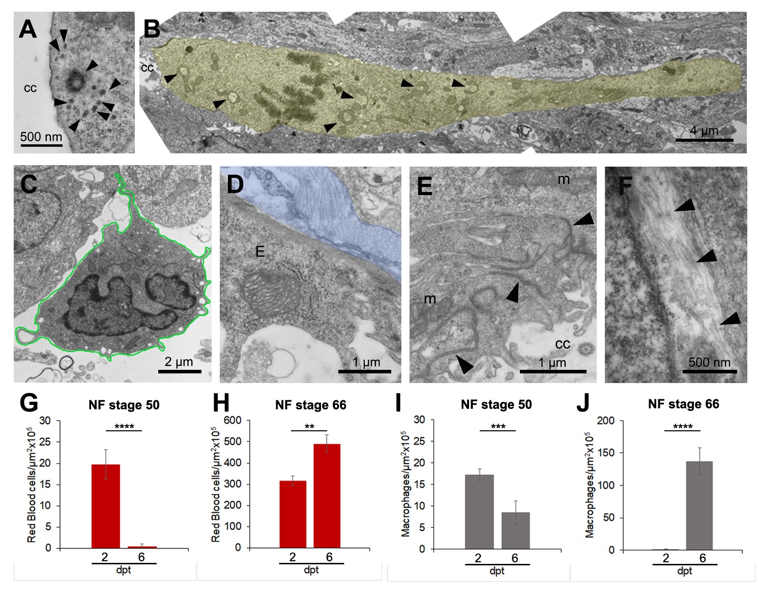 Figure S1. Cellular response to spinal cord injury in R- and NR-stages. (A) Centriolar satellite ultrastructure (arrowheads) in cells surrounding the rostral stump. (B) Radial projection of cells lining the central canal (yellow shadow). (C) Neutrophil in the injury site at 2 dpt in animals at NF stage 50. (C-E) Cells lining a rosette structure at 6 dpt are characterized by a (D) basal collagen lamina (blue shadow), (E) interdigitations and adherent junctions (arrowheads), and (F) intermediate filaments (arrowheads). Graphs of the number of red blood cells/μm2 Ãâ105 at (G) 2 and 6 dpt in NF stage 50, and (H) at 2 and 6 dpt in NF stage 66. Graphs of the number of macrophages/μm2 Ãâ105 at (I) 2 and 6 dpt in NF stage 50, and (J) at 2 and 6 dpt in NF stage 66. t-Test: ** pâ<â0,01; *** pâ<â0,001; **** pâ<â0,0001. |
