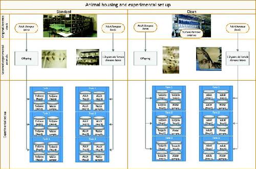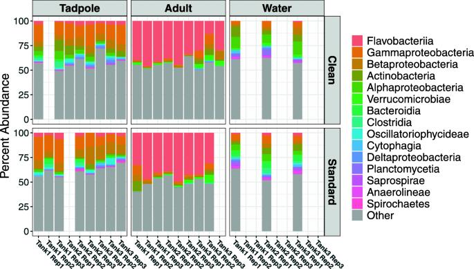 BACKGROUND: Historically the main source of laboratory Xenopus laevis was the environment. The increase in genetically altered animals and evolving governmental constraints around using wild-caught animals for research has led to the establishment of resource centres that supply animals and reagents worldwide, such as the European Xenopus Resource Centre. In the last decade, centres were encouraged to keep animals in a "low microbial load" or "clean" state, where embryos are surface sterilized before entering the housing system; instead of the conventional, "standard" conditions where frogs and embryos are kept without prior surface treatment. Despite Xenopus laevis having been kept in captivity for almost a century, surprisingly little is known about the frogs as a holobiont and how changing the microbiome may affect resistance to disease. This study examines how the different treatment conditions, "clean" and "standard" husbandry in recirculating housing, affects the skin microbiome of tadpoles and female adults. This is particularly important when considering the potential for poor welfare caused by a change in husbandry method as animals move from resource centres to smaller research colonies.