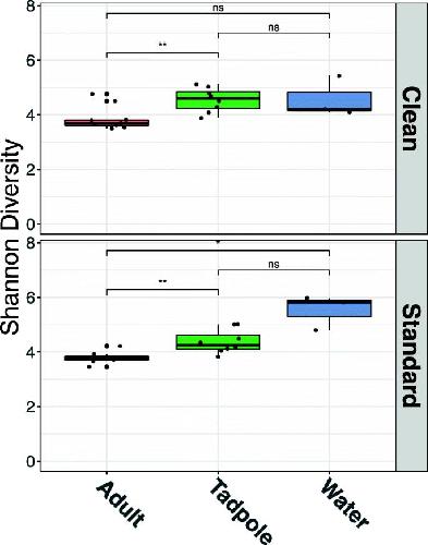 Fig 3. Principal coordinates analysis (PCoA) of all samples in the data set. Axis 1 and Axis 2 represent the coordinates of the greatest sources of orthogonal variation within the data and represent 27.9 and 9.4% of variation in the entire data set respectively. Whilst results from biological replicates and distinct tanks are generally consistent, Axis 1 represents the difference in diversity between the adult frogs as compared to both tadpoles and environmental water samples. Axis 2 shows close clustering between adults housed in standard and clean conditions, and tadpoles and their environmental water samples for clean conditions only. However, a significant change in diversity is seen for tadpoles from standard conditions, despite water samples from standard tanks showing similar profiles to those from clean tanks.