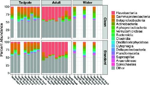RESULTS: We found strong evidence for developmental control of the surface microbiome on Xenopus laevis; adults had extremely similar microbial communities independent of their housing, while both tadpole and environmental microbiome communities were less resilient and showed greater diversity.