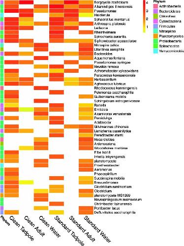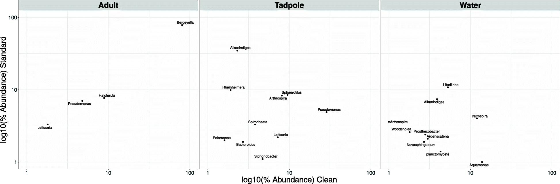 Fig. 7. Relative abundance (%) of core microbiome members shared between clean and standard housing conditions for adult, ii) tadpole, and iii) environmental water samples. OTUs were combined at the Genus level and were identified as core microbiome members based on an average relative abundance greater than 1% in both Clean and Standard conditions. Comparative relative abundance (on a log10 scale) is plotted for clean and standard conditions to highlight similarities and differences between the housing conditions