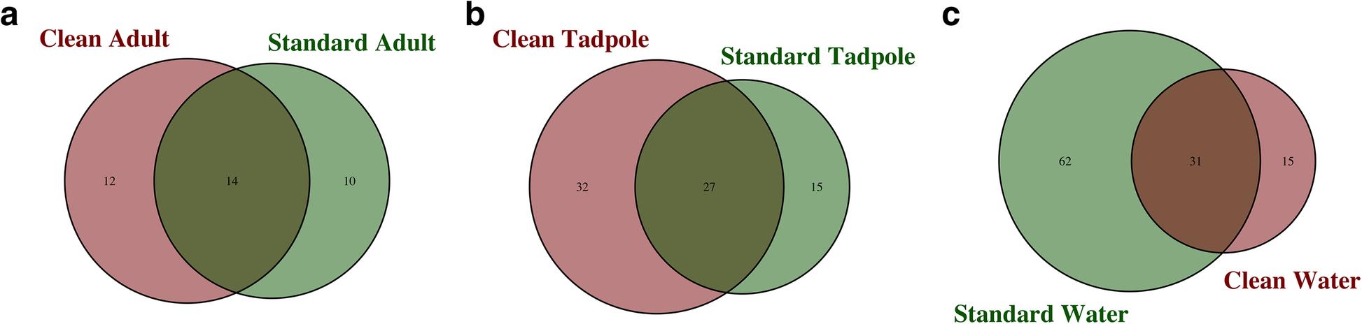 Fig. 5. Comparison between genera identified on adult frogs, tadpoles and in water controls. Venn diagrams showing the overlap between unique genera identified in samples from standard conditions compared to clean conditions for a) adult frogs, b) tadpoles and c) water samples.