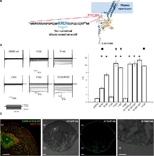 Fig. 1. Identification of a noncanonical dibasic retention motif by expression of GIRK5 mutants in X. laevis oocytes. (A) The lysineâarginineâtyrosine (KRXY) based endoplasmic retention motif at the N terminus of GIRK5 is depicted. 3D structure of GIRK5 was modeled at IâTasser server ([67]; https://zhanglab.ccmb.med.umich.edu/IâTASSER/). The predicted structure was visualized through the UCSF Chimera ([68]; http://www.rbvi.ucsf.edu/chimera/) and secondary structure elements were assigned according to SCOT [69]. (B) Representative currentâtime recordings for GIRK5 WT and K13, R14, L15, Y16, K13R14 alanine mutants. Normalized currents (I/I 0) were registered at â160 mV. Mutants have a significant difference compared to GIRK5 WT (*, oneâway ANOVA, P < 0.01). Based on endogenous phosphorylation of Y16 [30], the effect of a negative charge at Y16 was evaluated with Y16D. There was not a significant difference between Y16A and Y16F (â) (oneâway ANOVA, P < 0.01). Arginine (R) mutant at 13 position did not preserve the retention motif KRXYPi (â ). Error bars correspond to mean ± SEM of independent experimental observations (n = 12â15) of independent experimental observations. Recording solution contained: 118 mm KCl, 1 mm CaCl2, 2 mm MgCl2, and 5 mm HEPES, pH 7.4. Recording pipette was filled with 3 m KCl. Voltage pulse protocols were performed using consecutive 100âms step changes from â160 to +60 mV with increments of 20 mV. Oocytes were clamped at a holding potential of 0 mV. (C) Confocal and light transmission images of X. laevis oocyte sections. The EGFPâGIRK5 WT and ECFPâER constructs were colocalized in the nucleus (n) and ER (yellow) of the animal pole (ap); they are shown in the first panel. Merge images of the oocyte injected with the GIRK5K13AR14AâEGFP construct are shown in the other panels. GIRK5K13AR14AâEGFP was located in the cytoplasm (vesicles) and plasma membrane of the vegetal pole (vp). Circumference oocyte (in confocal image) and limit between the animal and vegetal poles are indicated on with a dotted line. Scale bar, 100 µm. |