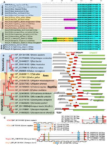 Fig. 3. Sequence analysis of some selected GIRK4/GIRK5 channels that belong to fishes, amphibians, reptiles, avian, and mammals. (A) Multiple amino acid sequence alignment of 22 GIRK4/GIRK5 channels showing the N termini of the proteins: residues from homologous exons are lighted with the same color (green, yellow, pink, or light blue). The noncanonical KRLY retention signal of GIRK5 from X. laevis and X. tropicalis is indicated in red letters into their second exon (yellow lighted). Sequence names indicate coding gene | species name | protein sequence length. (B) Phylogenetic analysis and gene context (synteny) of selected GIRK4/GIRK5 channels. The phylogenetic tree was constructed with 22 GIRK4/GIRK5 protein sequences coded by Kcnj5 genes. Sequence names indicate accession number for each GIRK4/GIRK5 protein channel followed by the species name. The evolutionary history was inferred from 500 replicates, using the Maximum Likelihood method based on the JonesâTaylorâThornton matrixâbased model w/freq. Percent bootstrap values are shown next to the branches. Evolutionary analyses were conducted in MEGA7 [40]. The gene context (synteny) of each Kcnj5 gene is indicated to the right of each sequence included in the tree (arrows represent genes and direction of transcription). Flanking Kcnj1âKcnj5 gene pair (coding for Kir1.1 and GIRK4/GIRK5 channels, respectively), Arhgap32 gene (encoding a Rho GTPase activating protein 32), and Fli1 (encoding Friend leukemia integration 1 (Fliâ1) protoâoncogene) can be found; in humans, TP53AIP1 gene, coding for tumor protein p53 regulated apoptosis inducing protein 1 is located between KCNJ5 and ARHGAP32 genes. GIRK4/GIRK5 sequences from fishes are not shown because their synteny is not conserved; and synteny of X. laevis Kcnj5.S is not shown because the available sequence is just a fragment. Genes are drawn on the same scale. (C) intronâexon structure comparison between Kcnj1 and Kcnj5 gene pair from human and X. laevis. Coding exons are indicated by arrows (colored according to the colors used in panel A), untranslated region by short boxes (colored red for Kcnj5, and orange for Kcnj1), and introns by black lines. |