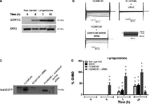 Fig. 4. Disruption of the KRXY motif accelerates X. laevis oocyte maturation. (A) pERK1/2 (44 kDa) immunoblotting of noninjected oocytes incubated at 5, 7, and 10 h with progesterone (10 μm); ERK2 (42 kDa) was used as a loading control (representative of three independent experiments). (B) Current traces recorded for the GIRK5âK13AR14A mutant. Voltage pulse protocols were performed using consecutive 100 ms step changes from â160 to +60 mV with increments of 20 mV. Oocytes were clamped at a holding potential of 0 mV. Silencing the gene encoding GIRK5 by specific siRNA suppressed K+ currents. (C) GIRK5 silencing was confirmed by EGFPâGIRK5K13AR14A (75 kDa) immunoblotting (representative of three independent experiments). (D) %GBVD was determined for noninjected and oocytes expressing: GIRK5 WT, GIRK5K13AR14A, and GIRK5K13AR14A plus siRNA GIRK5. Only GIRK5K13AR14A allowed progesteroneâinduced oocyte maturation up to 10 h. (*) Significant difference in oocyte maturation expressing WT or GIRK5K13AR14A compared to silenced GIRK5K13AR14A. (â) Significant difference in the maturation of oocytes expressing GIRK5K13AR14A at 5, 7 and 10 h compared to WT and noninjected oocytes (OneâWay ANOVA, P < 0.01). Error bars correspond to mean ± SE, n = 15. |