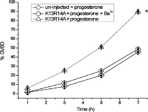 Fig. 5. Effect of external barium block on GIRK5âprogesteroneâinduced oocyte maturation. %GVBD was determined after 7 h of incubation in the ND96 solution, barium (111 μm) and progesterone (10 μm). (*) indicates a significant difference with respect to the other treatments (oneâway ANOVA, P < 0.01). Error bars correspond to mean ± SE, n = 15. |