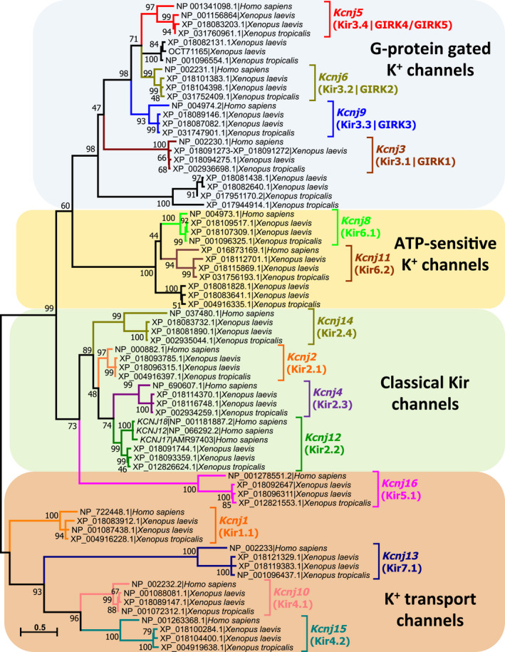 Fig. 2. Phylogenetic analysis of inwardly rectifying potassium (Kir) channels present in human, X. laevis and X. tropicalis. The phylogenetic tree was constructed with 72 Kir protein sequences (17 from human, 19 from X. tropicalis, and 36 from X. laevis (a tetraploid frog) that can be classified into four functional groups. Accession numbers of each protein sequence as well as Kir channel subfamilies previously described in humans are indicated. The evolutionary history was inferred from 500 replicates, using the Maximum Likelihood method based on the Jones–Taylor–Thornton matrix‐based model w/freq. The tree with the highest log likelihood (−21 352.85) is shown. Evolutionary analyses were conducted in MEGA7 [40], considering a total of 581 positions in the final dataset. Tree branches are drawn to scale, with the bar length indicating the number of substitutions per site. The percentage of trees in which the associated taxa clustered together in the bootstrap test (500 replicates) is shown next to the branches. Branch lengths represent the number of substitutions per site as indicated by the bar. |