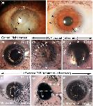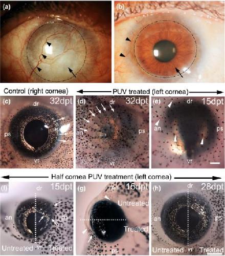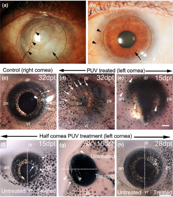 FIGURE 1 Limbal stem sell deficiency and stem cell transplantation in humans, and stem cell deficiency and corneal restoration in Xenopus.(a) Example of a human cornea with total limbal stem cell deficiency after receiving a chemical burn with involvement of the corneal stroma.Corneal opacification (black arrows) and neovascularization (black arrowheads) is apparent. (b) Example of another patient who received acultivated autologous limbal stem-cell graft, and penetrating keratoplasty (in some cases, this secondary corneal transplant from an allogeniccornea is necessary for improving visual acuity), showing successful restoration of a transparent corneal epithelium (black arrow). Vascularizationis now restricted to the conjunctiva (black arrowheads). Dotted black circle outlines the cornea region. (câe) PUV treatment model of stem celldeficiency in Xenopus recapitulates the hallmarks of human limbal stem cell deficiency. (c) Control frog cornea depicting normal transparentmorphology. The cornea is free of vasculature, pigment cells, and the lateral line organs (white arrows) are restricted to the surrounding skin.(d) PUV treated cornea at 32 days post treatment (dpt), depicting the loss of transparency. The cornea is covered with epidermal tissue similar tothat surrounding the eye. Skin cells, including pigment cells, and the lateral line organs (white arrows), have invaded the corneal region. Note linesof melanophores between the lateral line organs. (e) Younger PUV treated case at 15dpt, depicting vascularization with multiple blood vesselspassing into the cornea (white arrowheads). (fâh) PUV treatment localized to one half of the Xenopus cornea is eventually restored. (f) At 15 dayspost PUV treatment, the treated half shows opacity and increased pigmentation (white arrows), whereas the untreated half is devoid of pigmentcells and remains transparent. (g) Dorsal view of the specimen shown in (f) shows neovascularization (white arrowheads), and increasedpigmentation (white arrows). (h) At 28 days post PUV treatment, the treated half of the cornea has been restored. It is now transparent and freefrom pigment cells. an, anterior side; dr, dorsal side; ps, posterior side; vr, ventral side. Scale bar in (e) equals 665 îm for (c,d), and 200 îm for (e).Scale bar in (h) equals 500 îm for (fâh). Image in (a) is from Sacchetti et al. (2018), Limbal Stem Cell Transplantation: Clinical Results, Limits, andPerspectives, Copyright © (2018), open access article distributed under the Creative Commons Attribution 4.0 International License (http://creativecommons.org/licenses/by/4.0/). Image in (b) is from Paolo, R., Matuska, S., Paganoni, G., et al. Limbal stem-cell therapy and long-termcorneal regeneration, The New England Journal of Medicine, 363(2), 147â155. Copyright © (2010) Massachusetts Medical Society, Reprinted withpermission from Massachusetts Medical Society. Images in (c,eâh) are reprinted from Adil, M. T., Simons, C. M., Sonam, S., Henry, J. J.Understanding cornea homeostasis and wound healing using a novel model of stem cell deficiency in Xenopus, Experimental Eye Research, 187,107767. Copyright (2019), with permission from Elsevier |