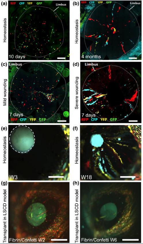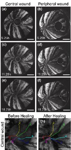 IGURE 2 Wound healing and cell tracking in the mousePAX6-GFP model. (a,c,e) Images from time-lapse confocal microscopyshowing healing of a 1 mm diameter central wound in a PAX6-GFPmosaic corneal epithelium (the white areas are GFP-positive). Thewound completely closes by 18.75 hr (h) after wounding. (b,d,f)Healing of a peripheral wound showing closure and the formation of asecondary whorling pattern. By 18.75 hr this wound has not closedcompletely. Dotted circles show the extent of the wounds. (g,h) Highmagnification views and graphical representation detail the healing ofa central wound in a PAX6-GFP cornea. (g) View of the initial 1 mmwound and the future routes taken by tracked cell stripes (numbered1â6). (h) After 18 hr of healing the wound is completely closed, butthe stripes do not meet at the center of the original wound, and donot extend equally. Scale bars in (a)â(f) equal approximately 1 mm.Scale bar in H equals 500 îm and applies to (g) and (h). Images arefrom Mort et al. (2009), Mosaic analysis of stem cell function andwound healing in the mouse corneal epithelium, Copyright © 2009,Mort et al; licensee BioMed Central Ltd., open access articledistributed under the Creative Commons Attribution 4.0 InternationalLicense 4.0 (http://creativecommons.org/licenses/by/4.0/) |