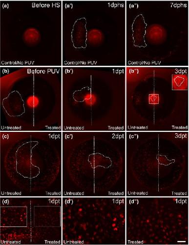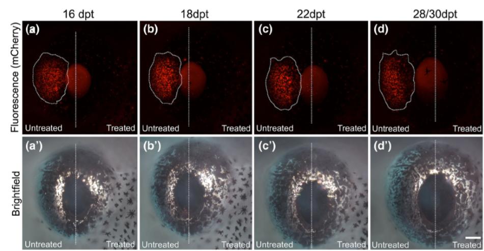 FIGURE 8 Response of labeled cells to increased UV exposure during localized PUV treatment in Xenopus.(aâd) Typical example showingnuclei labeled at 15dpt in the untreated half of the cornea in specimens that received PUV treatment in the other half. (see data in Appendix 3g).Representative mCherry images are shown at the time points indicated after PUV treatment. Labeled nuclei show minimal movement from 16 to28/30dpt. (a0âd0) Corresponding brightfield images of the specimen in (aâd) at respective time points. A similar response was seen as compared tocases show in Figure 7e above. Dotted white vertical line passes through the center of the cornea. White dotted enclosed area indicates clusterof heat-shock activated H2B-mCherry expressing nuclei. dpt, days post treatment. Scale in (d0) equals 200 îm |
