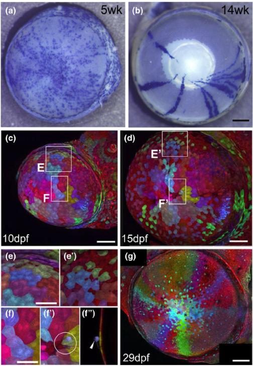 FIGURE 3 Lineage tracing in mice and zebrafish corneas. (a,b) Lineage tracing in CAGG driven LacZ mice. Eyes were stained for β-gal activityafter a 5 week (wk) chase period. (a) shows small β-gal positive patches throughout the cornea and conjunctiva. (b) After a 14 week chase periodstripes extend radially toward the center of the cornea. (câg) Long-term clonal analyses in the zebrafish cornea expressing the âZebrabowâconstruct. Recombination was induced at 6â12 hr post fertilization for expression of different fluorescent proteins, and images taken at the timepoints indicated. (c,d) Corneal clones at 10 and 15 days post fertilization (dpf). (e,e0) High magnification views near the periphery of the corneataken from (c) and (d), respectively. Labeled cornea clones near the periphery become scattered and interspersed by smaller cell clones. (f,f0) Highmagnification views near the center of the cornea taken from (c) and (d), respectively. Rosette-like structures are seen in the central cornea(compare f with f0, circle marks a rosette). (f00) Optical cross-section at the center of the rosette shown in (f0). A single blue cell has been extrudedfrom the corneal surface (arrowhead). (g) Example of well-established wedge-shaped clones in an older juvenile fish. Scale bar in (a) equals 0.5 mmfor (a,b). Scale bars equal 100 îm in (c,d); 50 îm in (e,e0,f,f0,f00); 200 îm in (g). Images in (a,b) are from Dora et al. (2015), Lineage tracing in theadult mouse corneal epithelium supports the limbal epithelial stem cell hypothesis with intermittent periods of stem cell quiescence, Copyright ©2015, Dora et al., published by Elsevier, open access article distributed under the Creative Commons Attribution License 4.0 (http://creativecommons.org/licenses/by/4.0/). Images in (câg) are from Pan et al. (2013), and reproduced with permission from Development, Copyright© (2013), The Company of Biologists Ltd |