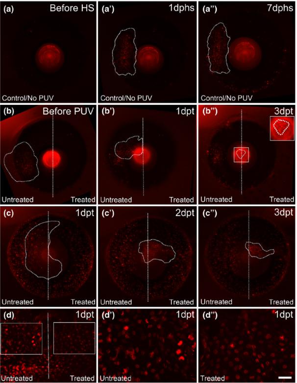 FIGURE 6 Response of cornea cells during homeostasis and following localized PUV treatment in Xenopus.(aâa00) Control transgenic corneasthat did not receive PUV treatment, showing unlabeled cornea immediately before localized heat-shock (a), and corneas showing labeled nuclei at1 day (a0) and 7 days post heat-shock (a00). Over time, the labeled cluster of cells has become somewhat elongated. (bâb00) Corneas showing theinitial location of heat-shock labeled nuclei (b), and their rapid displacement toward the treated side of the cornea 1 day after localized PUVtreatment (b0). These labeled nuclei presumably divide quickly to dilute the fluorescence by 3dpt as fewer labeled nuclei can be seen (b00, andinset). (câc00) Another example showing displacement of heat-shock labeled nuclei from 1 to 3dpt. This particular specimen has extensive leakybackground expression from the hsp70 promoter in deeper cells of the iris/retina. Nevertheless, the cluster of heat-shock labeled cornea cells isdistinctly detectable, and has become displaced to the PUV treated side by 3dpt. Note that the dotted area gets smaller as the labeled nuclei aredisplaced and undergo mitosis. (d) Excised flat mount of a cornea that received PUV treatment on one half and heat-shock to label the nuclei incells on the untreated half. Labeled nuclei are present in both halves at 1dpt. (d0,d00) Magnified images of the boxed areas in (d). Dotted whitevertical line passes through the center of the cornea. White dotted enclosed area indicates heat-shock activated H2B-mCherry expressing nuclei.dphs, days post heat-shock; dpt, days post treatment; HS, heat-shock; PUV, psoralen UV treatment. Number of cases examined (N) = 6 for controlcases; and for PUV treated cases, N = 19 for 1dpt, 9 for 2dpt, 10 for 3dpt. Scale bar in (d00) equals 50 um for (d0,d00), 100 um for (d), and 200 îmfor (aâc00 |