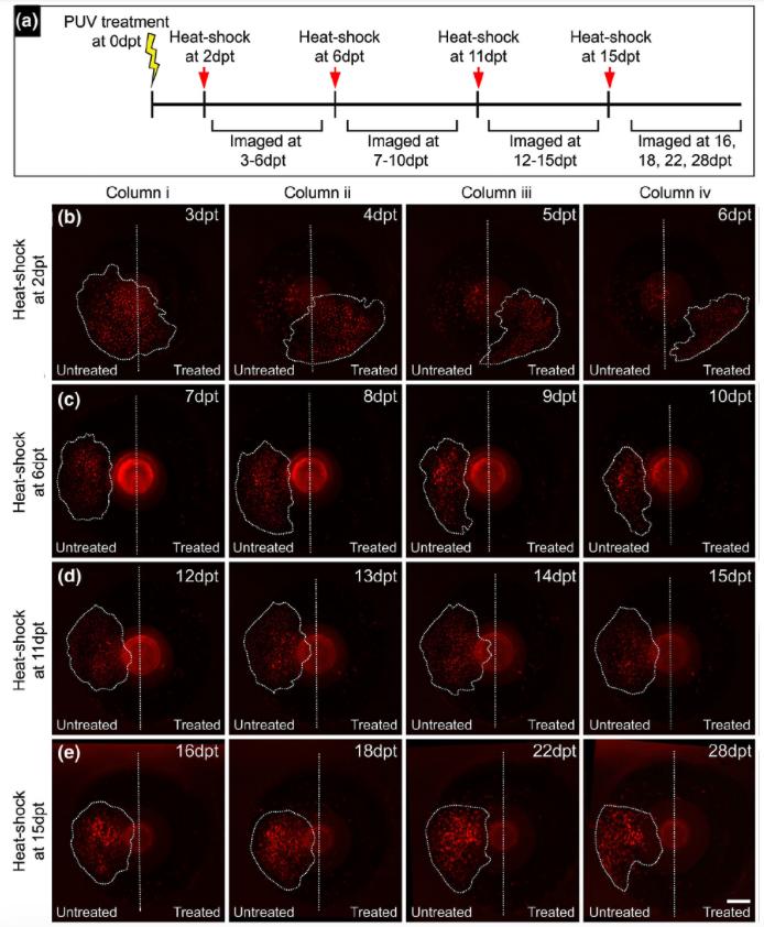 FIGURE 7 Response of cornea cells at later time points after localized PUV treatment in Xenopus. (a) Schematic of experimental outline.Specimens received PUV treatment on one half of the cornea. At 2, 6, 11, and 15dpt, specimens received heat-shock to a cluster of cells on theuntreated half of the corneas, and representative mCherry images are shown at various time points, as indicated (N = 11 for time points incolumns iâiii; N greater than or equal to 8 for time points in column iv). (b) Corneas showing rapid displacement of nuclei that were labeledinitially at 2dpt. (c,d,e) Corneas showing minimal movement in the nuclei that were labeled at 6, 11, and 15dpt, respectively. Dotted white verticalline passes through the center of the cornea. White dotted enclosed area indicate clusters of heat-shock activated H2B-mCherry expressingnuclei. dpt, days post treatment; PUV, psoralen UV treatment. Scale in (e column iv) equals 200 um |